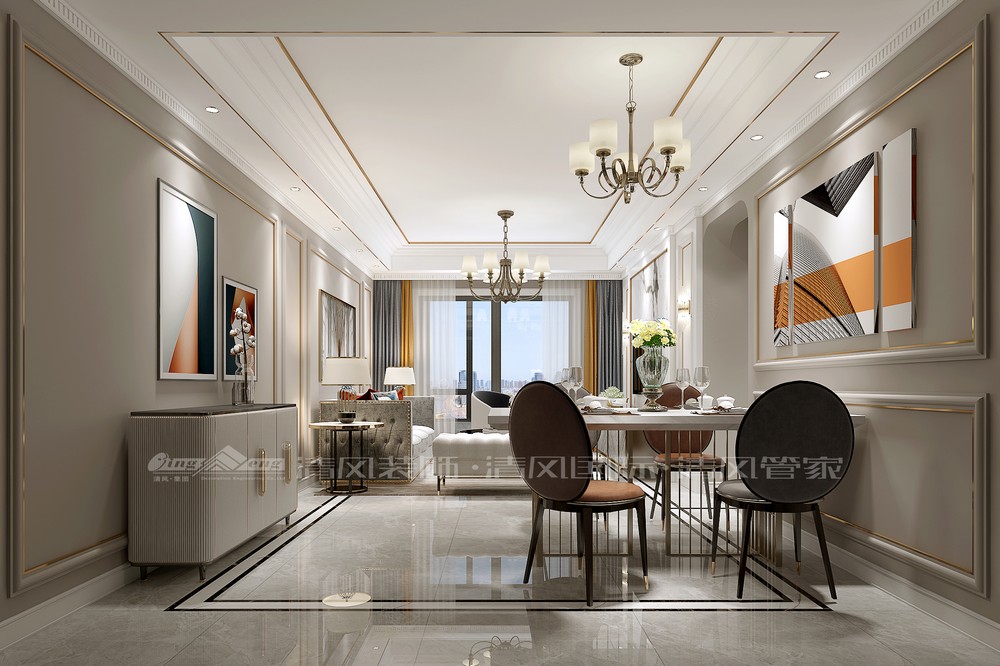 本案业主第一次到公司就订了设计,确定了美式风格最符合业主对家的期望,鉴于业主希望有足够的收纳空间,在餐厅处改动了墙体增设了餐边柜,进门口的玄关柜起到收纳以及装饰端景的作用,厨房采用整面移门增加了整个餐厅的采光度。 客餐厅以暖色系为主色,没有多余繁琐的线条,客厅整个空间宽敞明亮。最后用冷色调的皮质沙发配上暖色的窗帘, 加之亮黄色单椅,丰富整体空间色调。一遍遍的设计推敲,确保可以更好的利用空间也更加适合业主家庭生活。